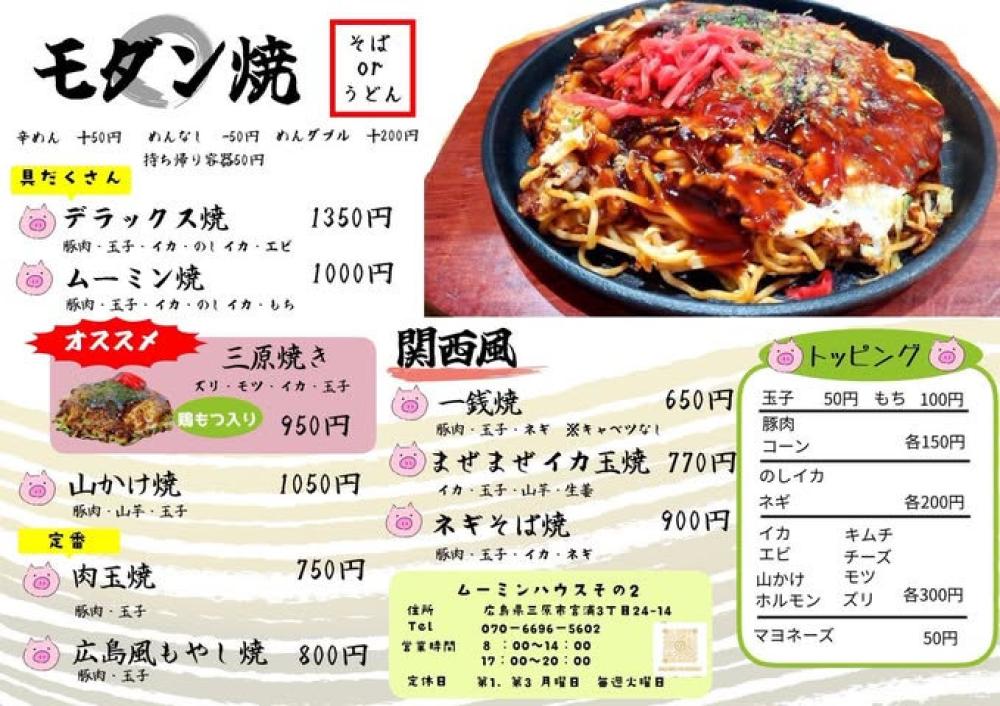 鶏もつ(ズリ・モツ)に玉子と、こだわりのイカが入るムーミンハウスの「三原焼き」はもちろん、各種モダン焼き・関西風もあり、トッピングでアレンジも楽しめます。