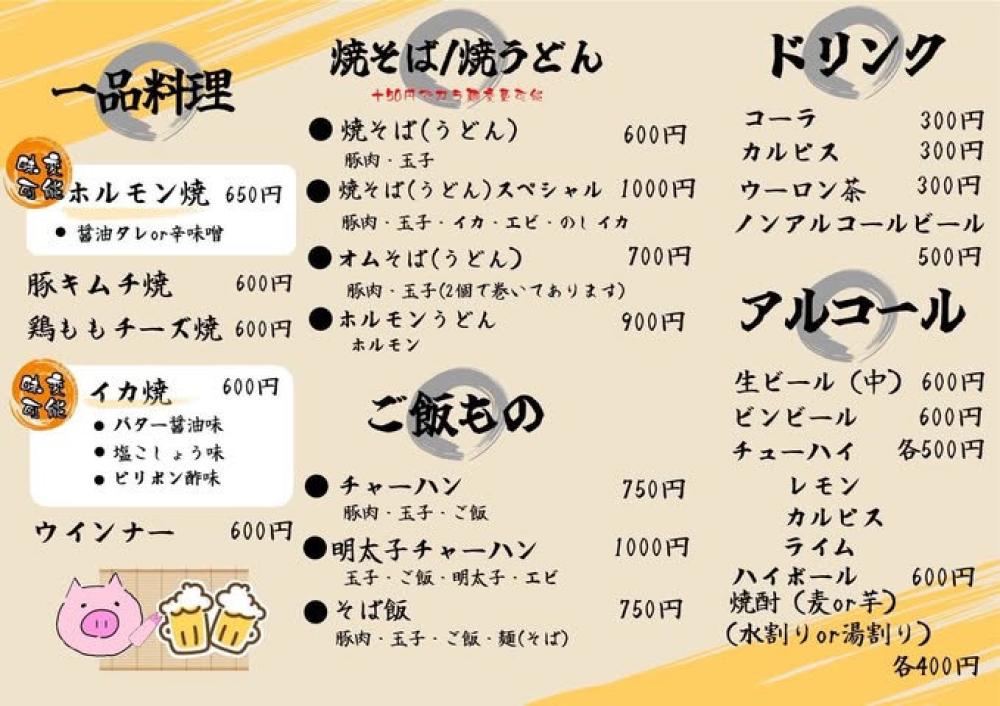 ホルモン焼き、豚キムチ焼きや、焼そば(うどん)・チャーハン等もメニューもあります。