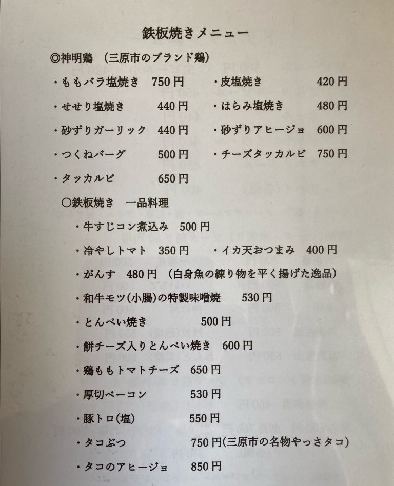 トッピングメニューには、大葉、イカ天、エビ、イカ、ネギ、チーズ盛盛があります。鉄板焼きでは、三原市のブランド鶏「神明鶏」のメニューが楽しめます!ドリンクメニューもいろいろありますので、お好み焼き・鉄板焼きと一緒にお召し上がりください。