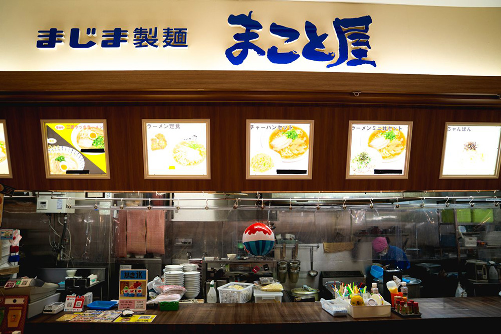 地元で製麺所を営む”まじま製麺”が運営する「まこと屋」は、イオン三原店のフードコートの一角で、お好み焼、ラーメン、うどんなど自慢の麺類を提供しています。