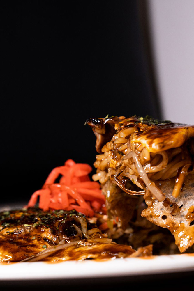 こちらの三原焼き(¥650)はレバーと砂ずりが入ります。もやしが入るのも、この辺ではめずらしいかもしれませんね。